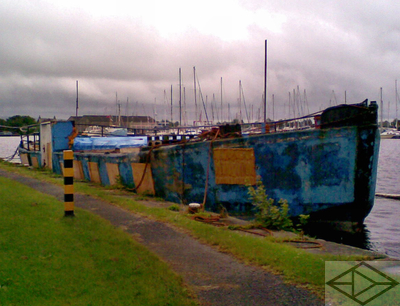 This concrete barge was originally spotted at Glasson Dock (ie the bottom of the Glasson Branch of the Lancaster Canal) in 2005 where it appeared to have been used as a floating restaurant (or possibly a night club?) but was then derelict. In 2010 it had moved to this location a few yards along; but in 2011 there was no sign. Was it removed? Dismantled? Sold? For comparison, the first photo shows how she looked in about 1994 (RS). She was apparently built during the second world war when steel was in short supply. Does anyone know more of its previous history?