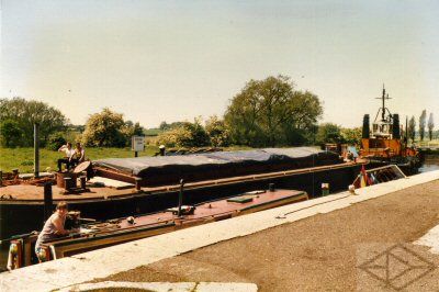 I took this shot in May 1985 at Anderton. It shows a new trial pusher tug and a loaded dumb barge which accompanied us down river on the Weaver. The tug did not appear to be a success (they kept running it up the bank!) but in retrospect I think it was connected wrongly. The crew had it on a loose hitch (as they would with a Bantam or similar) but I think this needed to be on a tight hitch so that the whole connection could function as a single unit.