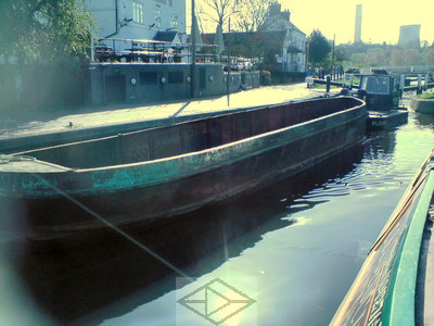 A short butty boat? Seen Trent Lock April 2014. Was this cut up to make this? (CALEB/TEBAY?) - seen August 2015 (note the green paint on both top bends)